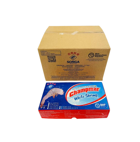 Enjoy delicious, farm-raised Songa Champmar White Shrimp with white heads and shells. 36-40 size means that each shrimp is approximately 36 to 40 shrimp per pound, making this a great medium size option for any dish. Comes in a convenient 6-pack, and each case contains 4lbs of shrimp.