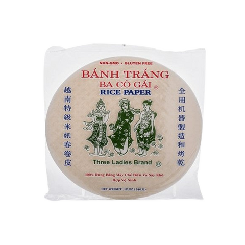 Three Ladies Brand Rice Paper is a high-quality, professional-grade product for making Vietnamese-style spring rolls. Each sheet is 25cm wide and 12oz in weight, making it ideal for wrapping and stuffing. Its thin, translucent texture ensures delicate rolls that are crisp and flavorful.